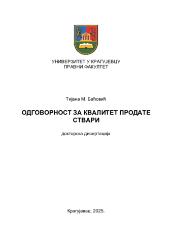 Doktorska disertacija pod nazivom „Odgovornost za kvalitet prodate stvari“ analizira dva važna pravna instituta: odgovornost za materijalne nedostatke (nesaobraznost robe) i garanciju, kao instrumente zaštite načela ekvivalentnosti uzajamnih prestacija kod dvostrano obaveznih, teretnih ugovora. U prvom dijelu rada, istražuje se istorijski razvoj instituta odgovornosti za materijalne nedostatke, te detaljno analizira njegova regulativa u pravu Republike Srbije i pravnim sistemima u BiH, inostranom pravu, kao i prema propisima koji uređuju međunarodnu prodaju robe, počev od pretpostavki odgovornosti za materijalne nedostatke, preko sadržine odgovornosti prodavca, uz ukazivanje na sporna pitanja kao i stavove sudske prakse vezane za ovu problematiku. Drugi dio rada fokusiran je na zaštitu prava potrošača, posebno u kontekstu prava Evropske unije. Ovaj dio analizira najznačajnije propise EU koji regulišu materiju odgovornosti za nesaobraznost robe ugovoru, njihovu implementaciju u nacionalna prava, njihov uticaj na opšti institut odgovornosti za materijalne nedostatke kao i usklađenost aktuelnih zakona o zaštiti potrošača u Srbiji i BiH sa komunitarnim pravom. Karakteristike, značaj, te način regulisanja instituta garancije u srpskom i bosansko-hercegovačkom pravu, kao i u uporednom pravu predmet su trećeg dijela disertacije. Pored odgovornih lica, pretpostavki odgovornosti, sadržine odgovornosti, u radu se ukazuje na sličnost, kao i na razlike u odnosu na institut odgovornosti za materijalne nedostatke. Razmatra se neophodnost postojanja ovih instituta u pravnim sistemima Srbije i BiH, kao i mogućnost njihove izmjene i prilagođavanja propisima Evropske unije sa ciljem podizanja nivoa zaštite potrošača.